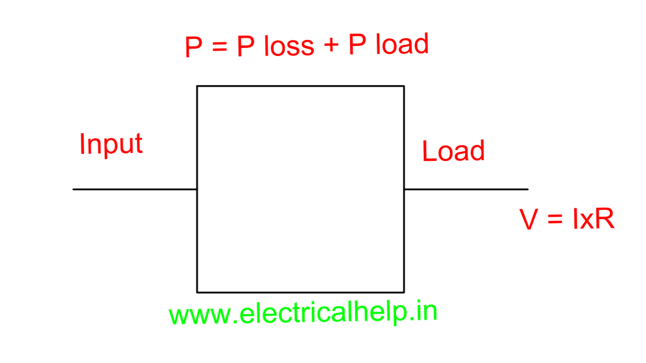 अब चलते हैं पावर की तरफ, अब आपको ऊपर दिये गए चित्र में एक इकविपमेंट दिखाया गया है, जिसमे एक इनपुट और एक आउटपुट जोड़ा गया है। और ये V = I×R ohm’s लॉ है जो हर हालत में फॉलो होता है। अब इनपुट में जो पावर बह रही है उसे हमने P लिखा है और जो आउटपुट में पावर बह रही है वो लोड है जिसे हमने P load लिखा है। इनके अलावा एक पॉवर और होती है जिसके हमने P loss के नाम से दर्शाया है।